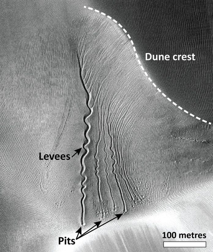 Her findings, published in Geophysical Research Letters, reveal that chunks of CO₂ ice — often called “dry ice” — can dig deep channels as they slide down Martian dunes.