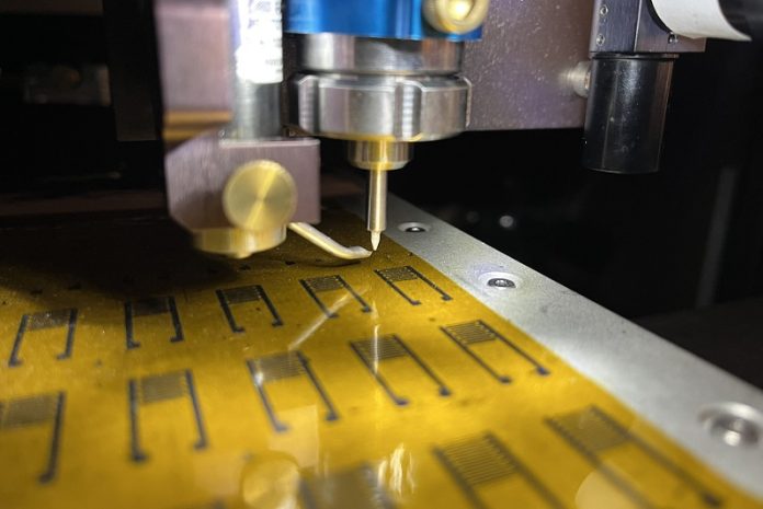 An aerosol jet printer in Hersam's laboratory deposits electronic inks onto a flexible polymer substrate. Credit: Mark Hersam/Northwestern University.